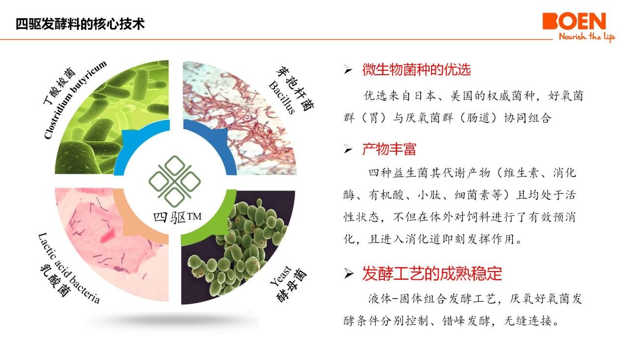 播恩四驅(qū)雙酸發(fā)酵料是一款運(yùn)用先進(jìn)生物工程技術(shù)研發(fā)的新時(shí)代產(chǎn)品。它精選芽孢桿菌、酵母菌、乳酸桿菌和丁酸梭菌四株優(yōu)質(zhì)菌種,采用厭氧和好氧相結(jié)合的發(fā)酵工藝,經(jīng)14天以上深度發(fā)酵,產(chǎn)生大量有益菌及其代謝產(chǎn)物。這種獨(dú)特的菌種組合和發(fā)酵工藝,賦予了四驅(qū)雙酸發(fā)酵料多重優(yōu)勢(shì):